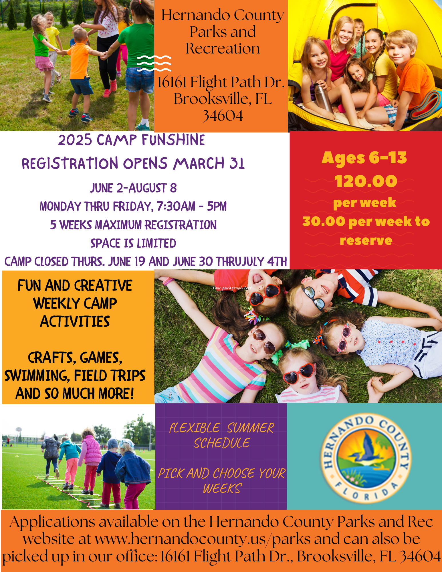 Hernando County Recreation Departmentโs Camp Funshine provides an exciting Summer Camp experience for youth ages 6 - 13. We provide at least 2 field trips per week as well as traditional camp activities, arts, crafts, sports and water activities. * Field Trips are subject to change due to weather or camp capacity. An alternative will be provided if necessary.